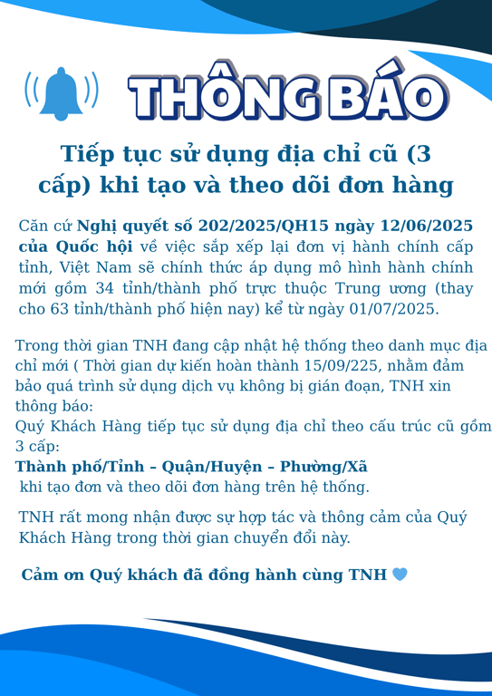 ➡️ Quý khách tiếp tục sử dụng địa chỉ 3 cấp: Thành phố/Tỉnh – Quận/Huyện – Phường/Xã khi tạo và theo dõi đơn hàng.